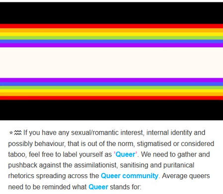 If you have any sexual/romantic interest, internal identity and possibly behaviour, that is out of the norm, stigmatised or considered taboo, feel free to label yourself as ’Queer’. We need to gather and pushback against the assimilationist, sanitising and puritanical rhetorics spreading across the Queer community. Average queers need to be reminded what Queer stands for: